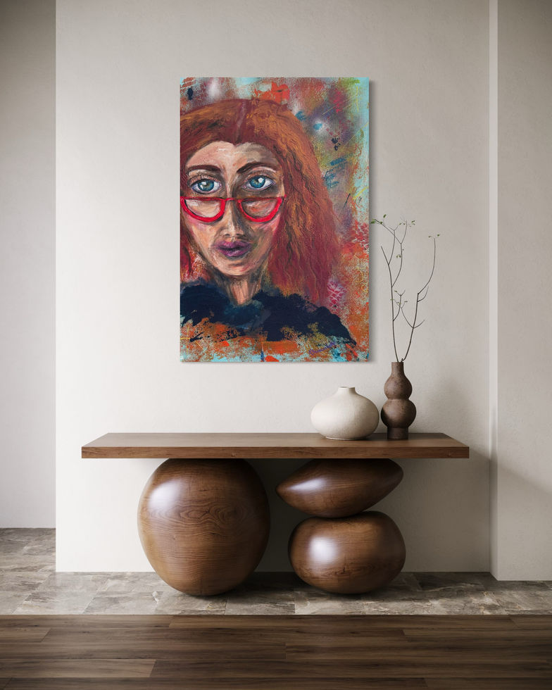 One in a series called "Spectacles" this 36x24" painting on a deep canvas is an expressive portrait with a great deal of style, introspection and emotional presence. The red glasses anchor the scene adding a bit of playfulness. Painted with depth and texture, it is sure to become a focal point in any room in your home or office.